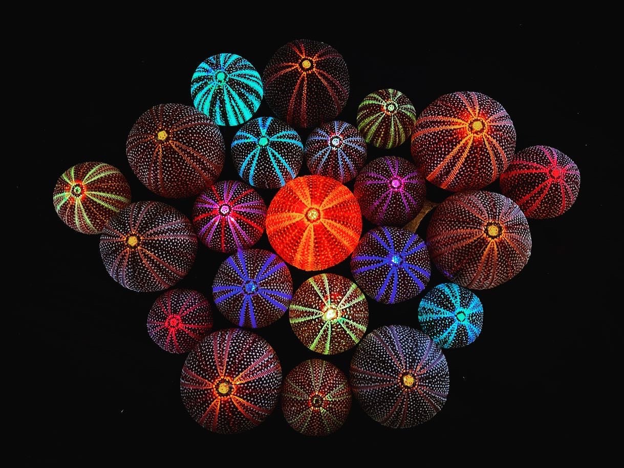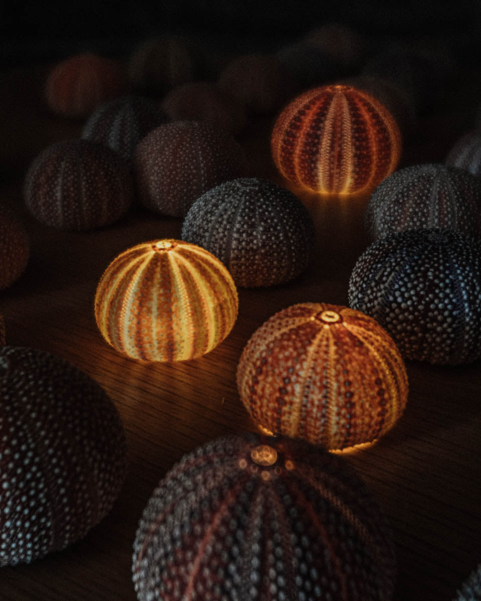 When Norway was shut down due to Covid, she had time to start diving after and experimenting with the different sea urchins. Discovering there are way to many of them leading to less kelp forest, she decided to start making lights of them, calling them Lofotlys!